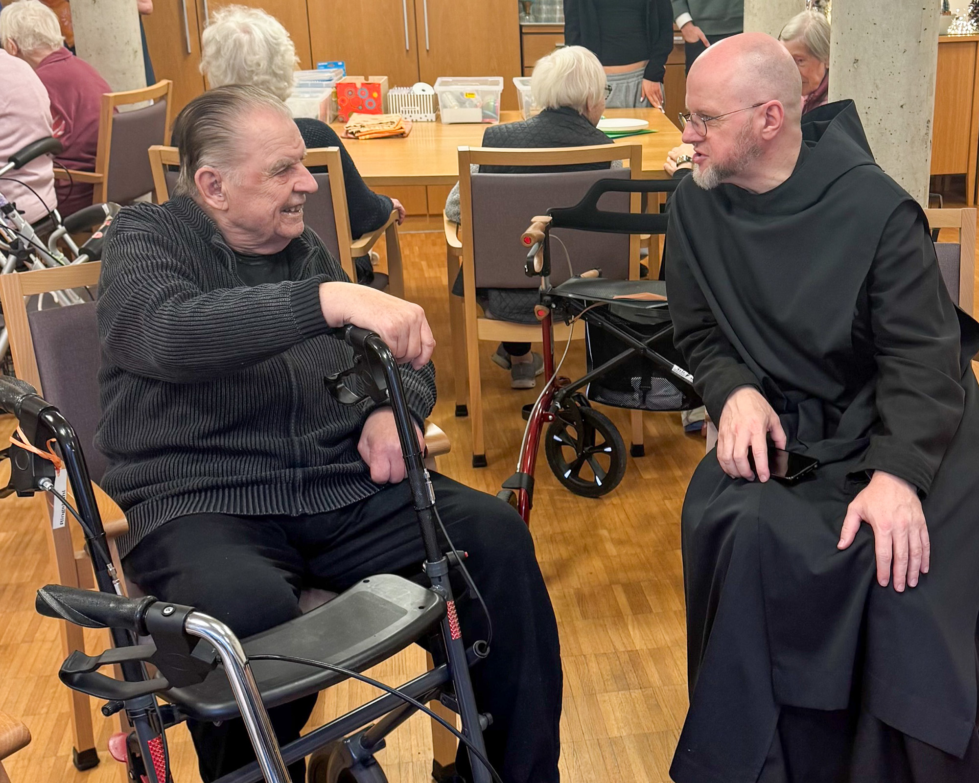 Im Rahmen der Projektwoche zur 125-Jahresfeier besuchten Schülerinnen und Schüler vom Egbert Gymnasiums Münsterschwarzach das Altenbetreuungszentrum. Ziel des Projekts war es, den generationsübergreifenden Austausch zu fördern und Einblicke in den Alltag der Seniorinnen und Senioren zu gewinnen.