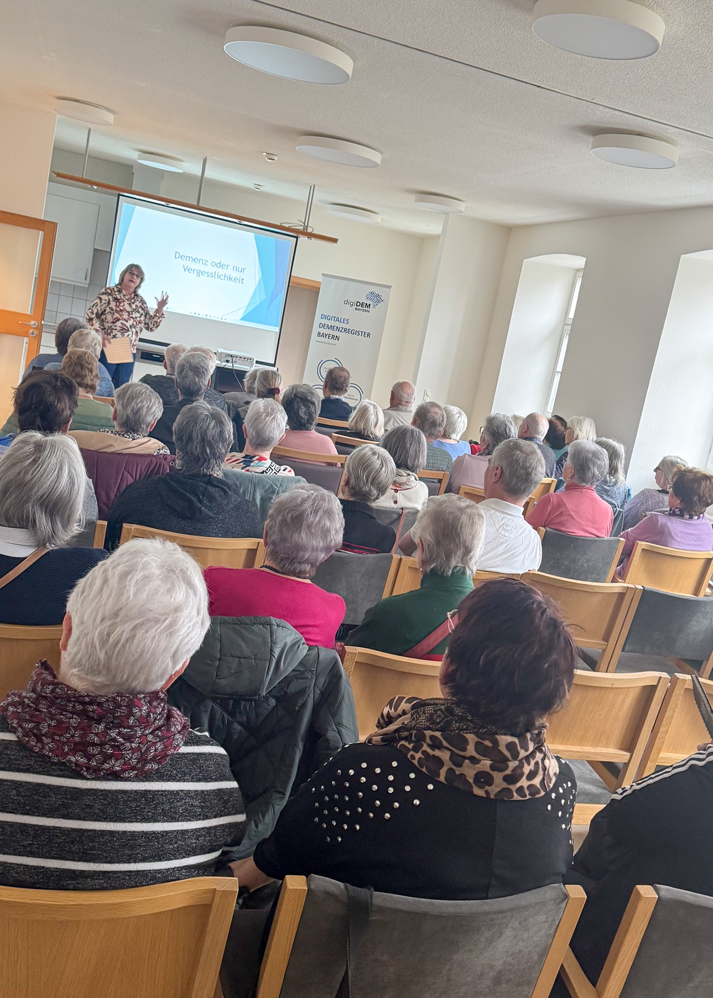 Referentin Brigitte Kriesinger von digiDEM Bayern erklärte in ihrem Vortrag anschaulich und verständlich die unterschiede zwischen normaler altersbedingter Vergesslichkeit und den Anzeichen einer beginnenden Demenzerkrankung. Dabei ging sie besonders auf typische Symptome, mögliche Ursachen sowie den Verlauf verschiedener Demenzformen ein. „Es ist wichtig, Veränderungen frühzeitig zu erkennen und ernst zu nehmen, aber auch zu wissen, dass nicht jede Vergesslichkeit gleich eine Demenz bedeutet,“ betont Kriesinger.