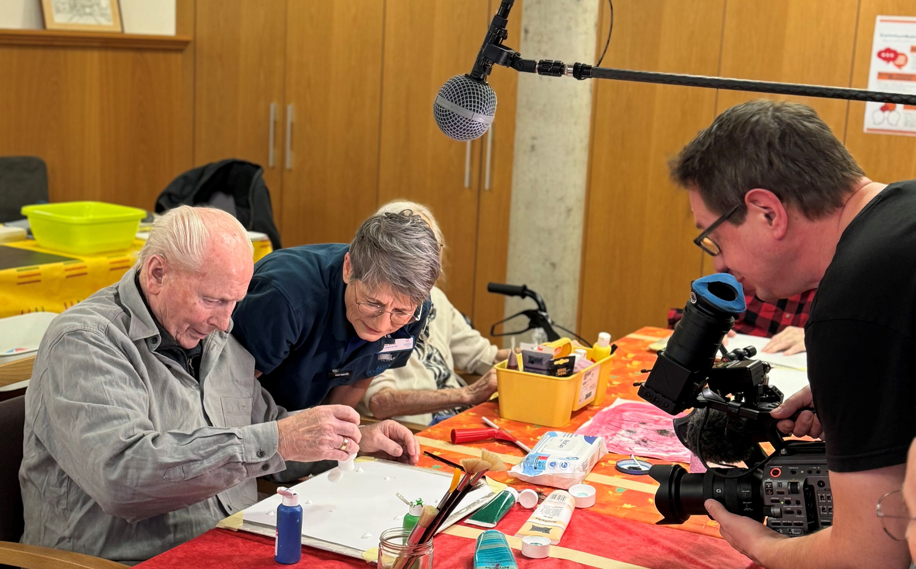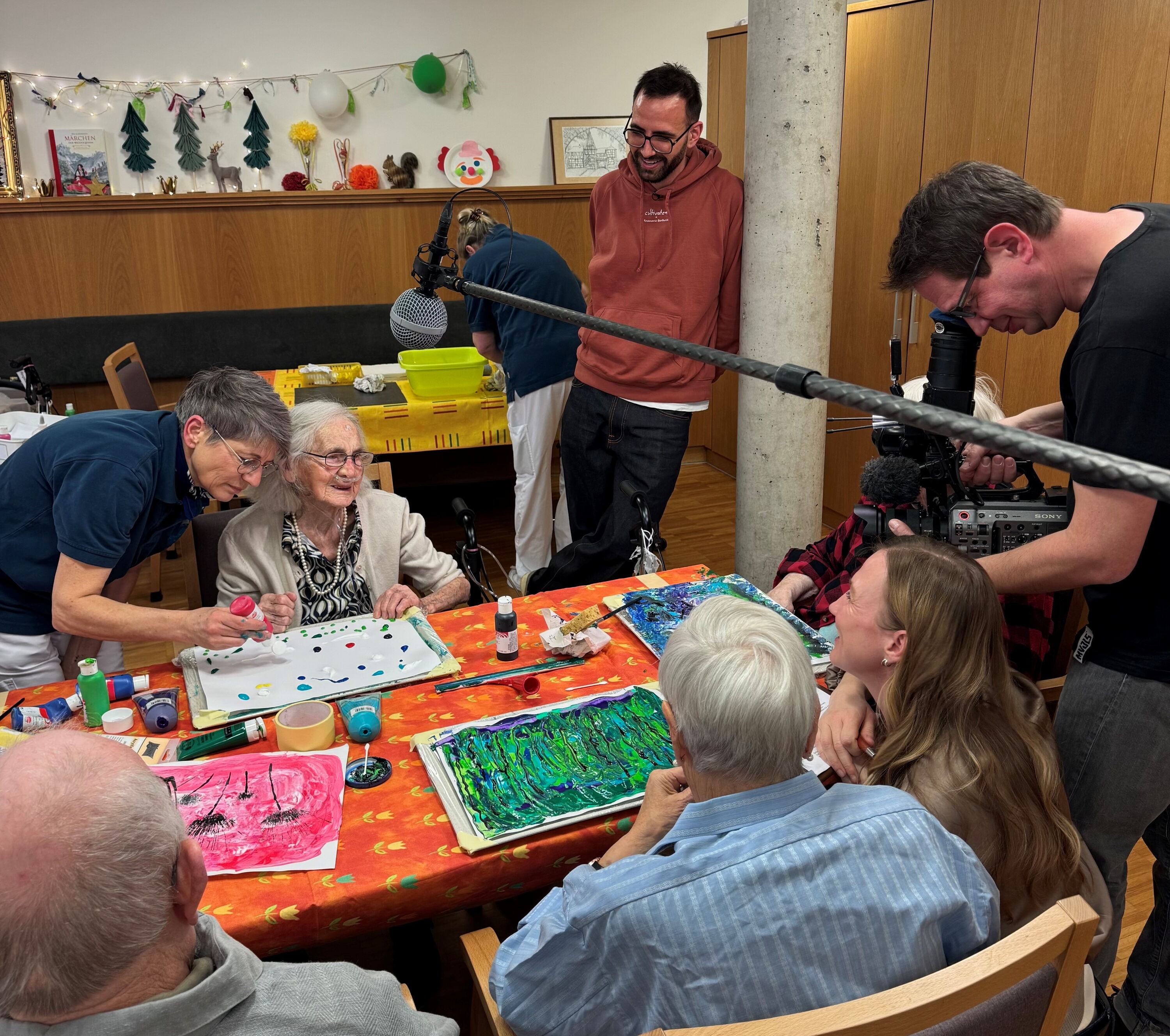 Das Team des Bayerischen Rundfunks begleitete die Kreativstunde mit der Kamera und führte Gesprächen mit den Beteiligten. Dabei wurde deutlich, wie wichtig solche Angebote für das Wohlbefinden und die Lebensqualität der Bewohnerinnen und Bewohner sind. Die herzliche Atmosphäre und das vertrauensvolle Miteinander zwischen den Mitarbeiterinnen und den Bewohnerinnen und Bewohnern hinterließen auch bei den Gästen einen sehr positiven Eindruck.